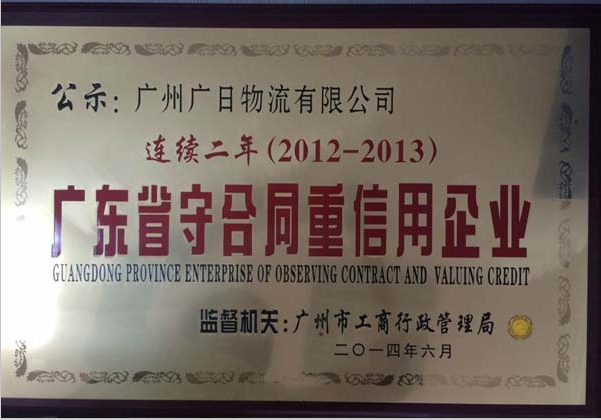 近日,廣日物流被廣州市工商行政管理局評選為連續(xù)兩年(2012-2013)“廣東省守合同重信用企業(yè)”。